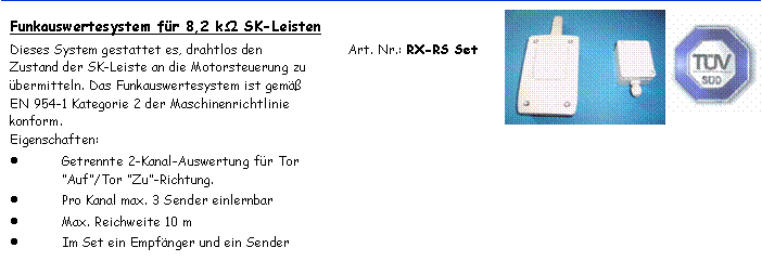 Bei den Sicherheitsklontaktleisten selbst haben sich die modernen SK-Leisten mit sich gegenüberstehenden leitfähigen Gummiprofilen durchgesetzt, da sie selbstüberwachend sind und die Reihenschaltung von mehreren Leisten gestatten. Bei diesem System unterscheidet man Durchgangsleisten und Endleisten. Nur in der Endleiste ist ein 8,2 kΩ- Widerstand und die Durchgangsleisten wirken wie 2 „Drähte“, die immer bis zur Endleiste hintereinander geschaltet werden. Zur ganzen „Leisten-Kette“ ist nur ein 2 adriges Kabel erforderlich. Zur Verbindung der SK-Leiste an der bewegten Hauptschließkante eines Tores ist immer ein so genanntes Übertragungssystem erforderlich, das die SK-Leiste an der bewegten Torkante mit der im Antrieb fest-stehenden Steuereinheit verbindet. Die von uns favorisierten Übertragungs– bzw. Auswertesysteme haben große Vorteile bei der Montage, den verminderten Transportkosten und die kompakteren mechanischen Abmessungen. |