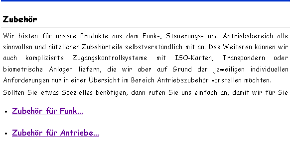 Willkommen auf unserer Produktkatalogseite. Wir bieten eine Vielzahl von Produkten an, die zu den Spitzenprodukten der Branche gehören. Zur besseren Übersichtlichkeit haben wir uns für eine Unterteilung in Funkfernsteuerungen und Torantriebstechnik entschieden, obwohl ja eigentlich beides zusammengehört. Klicken Sie sich einfach durch das Menü und überzeugen Sie sich in aller Ruhe von unseren Produkten. Im Downloadbereich steht auch ein kompletter Katalog mit nützlichen Anwendungshinweisen im pdf-Format zum download bereit. Sollten Sie etwas nicht finden oder einen besondere Anwendungsfall haben, so rufen Sie uns einfach an, wir können Ihnen fast immer weiterhelfen. Weitere Informationen und die Möglichkeit zu bestellen erhalten Sie, wenn Sie uns via E-Mail [durch Klicken der Schaltfläche „So erreichen Sie uns“] oder· telefonisch unter 036021 81540 oder 036021 84085;· mobil 0172 3604605 oder 0173 6712798 oder per· FAX 036021 92248kontaktieren. |