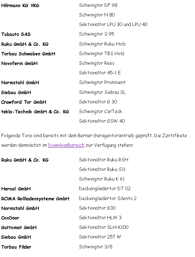 Die Neuinstallation oder die Nachrüstung an einem geprüften Tor ist mit einem Berner Garagentorantrieb problemlos möglich. Die Antriebe sind mit Toren folgender Herstellern zertifiziert. Die Zertifikate finden Sie im Downloadbereich. |